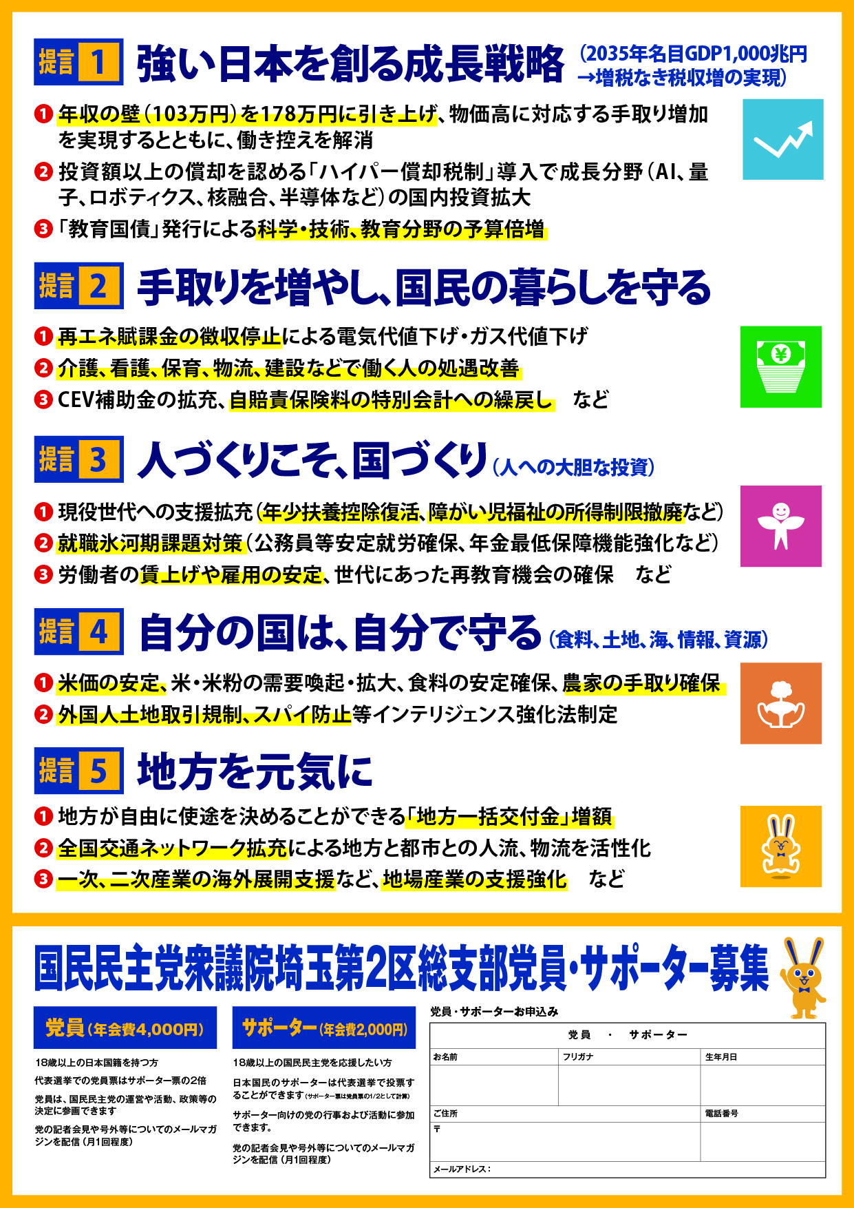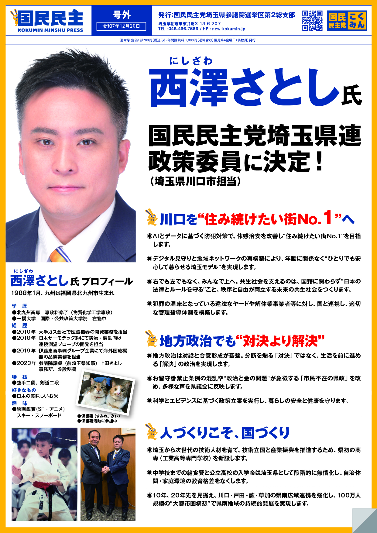 国民民主プレス号外を発行し、西澤さとしが国民民主党埼玉県連政策委員(埼玉県川口市担当)に決定したことをお知らせしました。ぜひご覧ください。